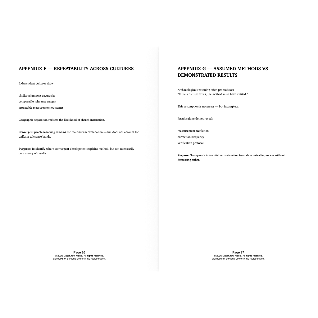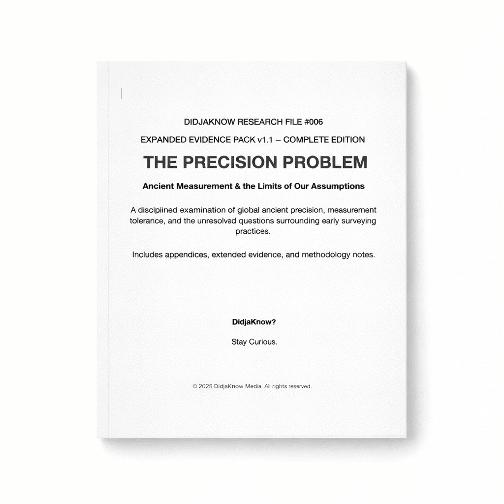 This publication is the Expanded Evidence Pack edition of the DidjaKnow research file examining ancient measurement precision — not scale, beauty, or symbolism, but measurable control: alignment accuracy, tolerance consistency, levelness across distance, and repeatability across unrelated cultures.