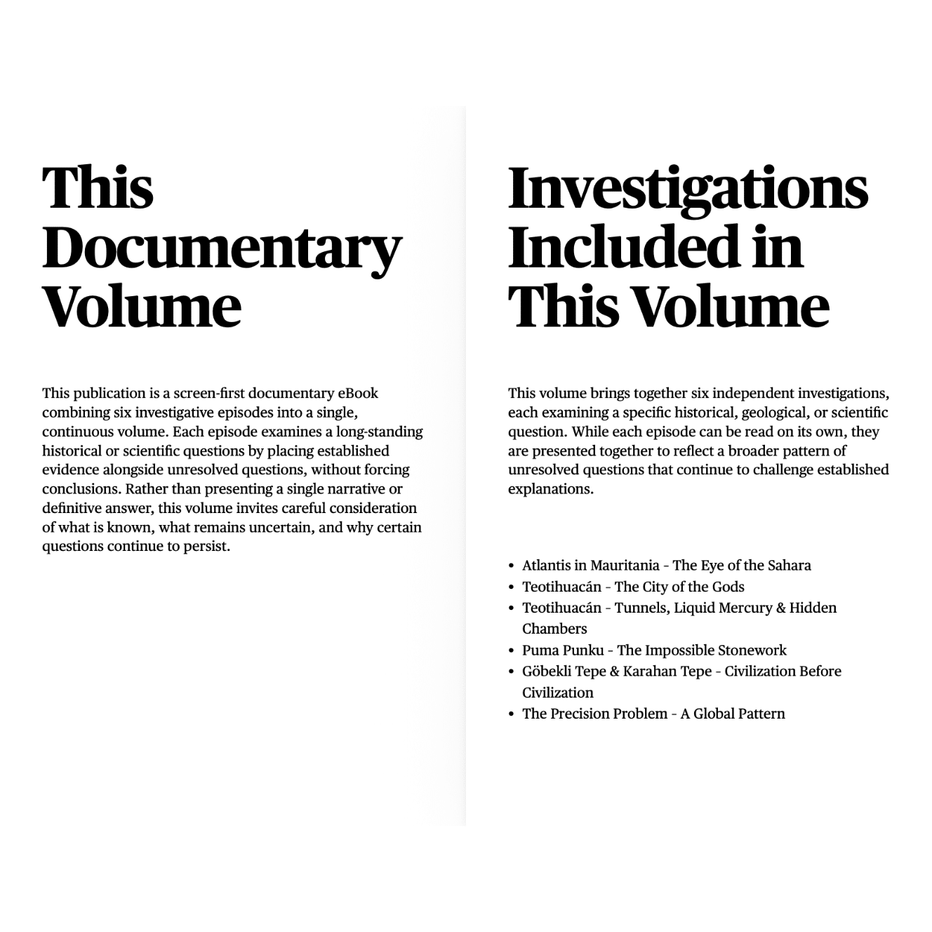 Unresolved Earth is a screen-first documentary eBook bringing together six in-depth investigations into ancient history, geology, and long-standing anomalies that continue to challenge conventional explanations.